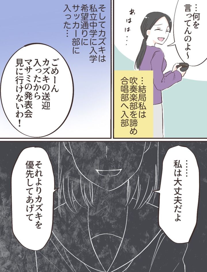 私が中学校に上がった時もそうでした。「お母さん!私、吹奏楽部に入りたいんだけどいいかな?」興奮気味に話す私に、母は「無理よ、カズキが中学受験するのよ?お金がかかる部活は諦めなさい」と冷たく言い放ちます。この時もカズキが優先されたせいで、私の希望はあっさり切り捨てられてしまいました。