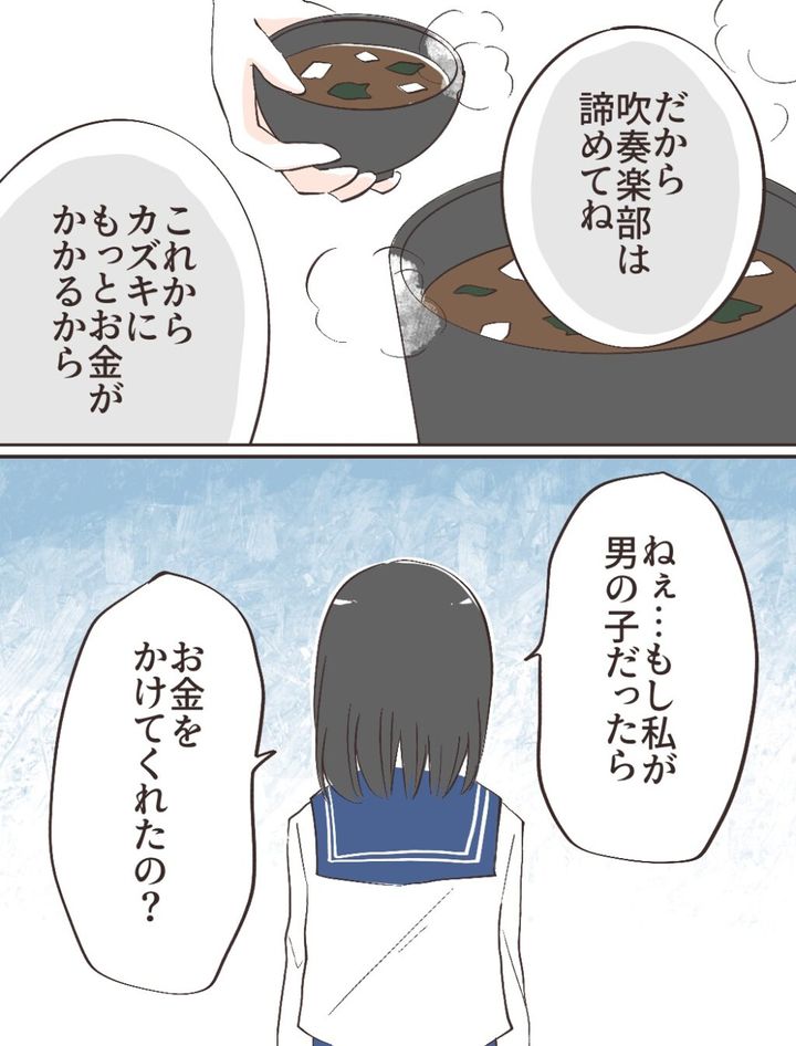 「だから吹奏楽部は諦めてね、これからカズキにもっとお金がかかるから」母のその言葉に、頭を殴られたような衝撃を受けました。カズキは男の子だから、何でも許されるの?女の子の私は、ただカズキの希望を叶えるために生きているの?胸に溜まった思いを堪えきれず、私は母に「ねぇ、もし私が男の子だったら、お金をかけてくれたの?」と問いかけました。