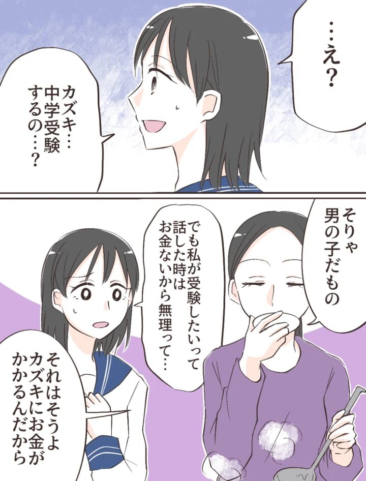 「・・・え?カズキ中学受験するの?」思わず聞き返すと、母は当然のように「そりゃ男の子だもの」と言いました。それだけでは納得がいかず「でも私が受験したいって話した時は、お金ないから無理って・・・」と訴えると、母は「それはそうよ、カズキにお金がかかるんだから」と私の目を見ることなく言いました。