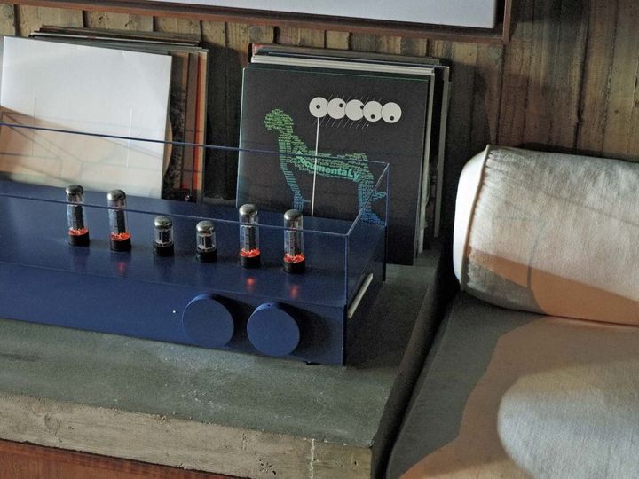 自作の真空管アンプ。壁に3 か所、スピーカーが埋め込まれ、音の響きの良さは格別。音楽を楽しむ空間でもある。