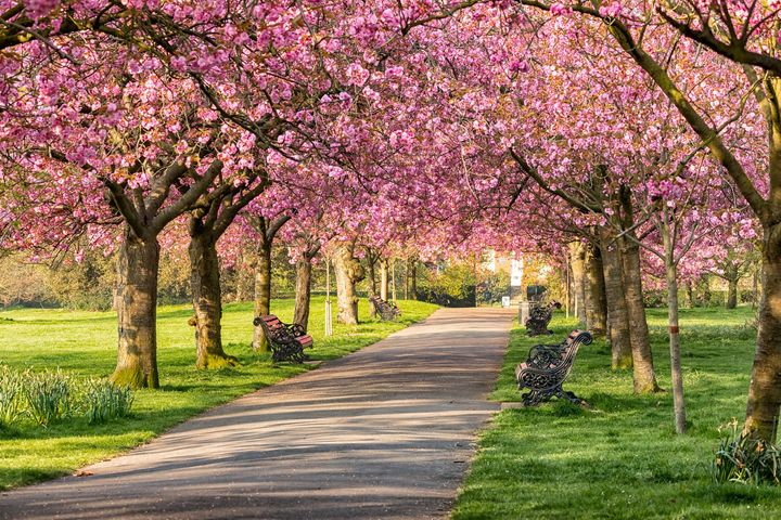 ローズ・ガーデンと桜並木が作る花のトンネルを見ることができるグリニッジ公園は、ピンク色の美しい花のなかでのピクニックに最適。