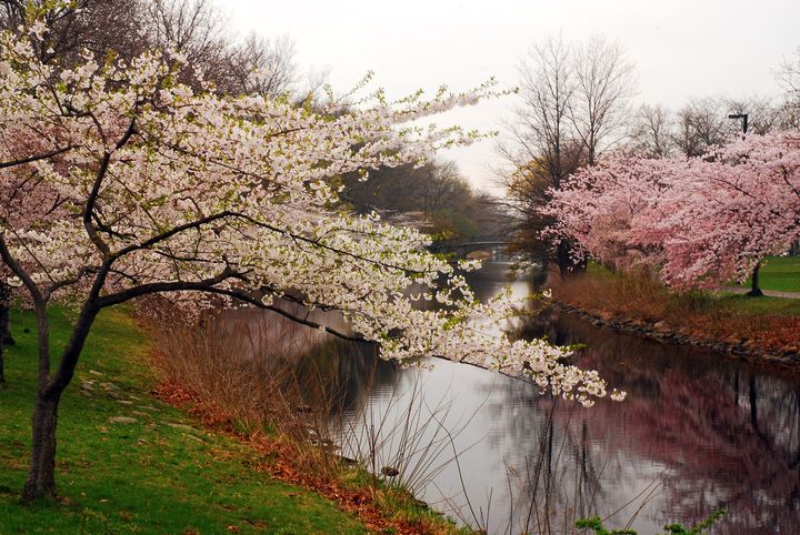 名門ハーバード大学やマサチューセッツ工科大学などを擁するカレッジタウンのケンブリッジと都市部の間を流れるチャールズ川沿いには、何種類もの桜が植えられている。