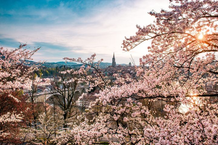 大きく蛇行して流れるアーレ川に囲まれたスイスの首都ベルンの旧市街では、ローズ・ガーデンの桜が毎年4月、開花の時期を迎える。