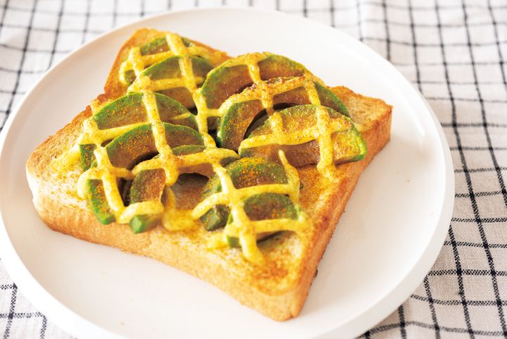 食パンに薄切りにしたアボカドを並べる。マヨネーズをかけ、カレー粉、塩をふり、オーブントースターで焼く。