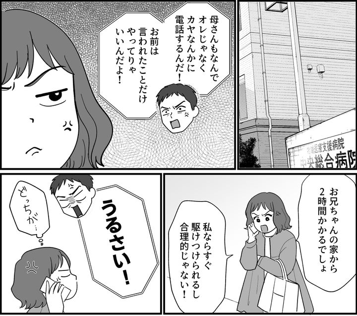 兄から電話口でグチグチ言われてウンザリです。兄は「カヤは、オレに言われたことだけやっときゃいい」なんて言いますが、実際、今回みたいにすぐ駆けつけなければいけない状況で、兄が全部仕切るというのは無理があると思うのです。