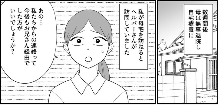 母の退院後、ヘルパーさんからも「娘さんと直接連絡を取りたい」と言われて、改めて兄との連携の難しさを痛感。