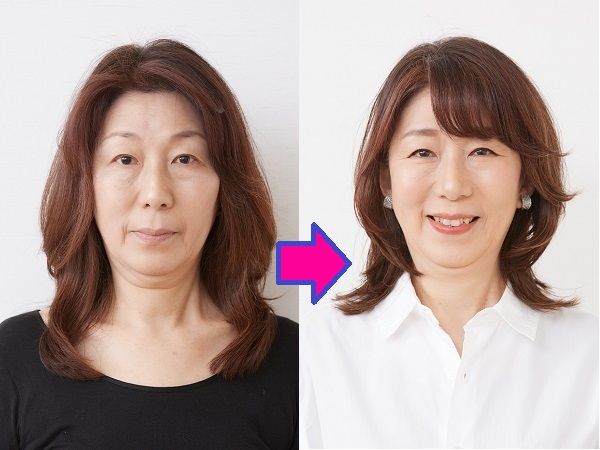 メイクでは、目と眉の間が短くなり、全体的に引き上がってフェイスラインもスッキリして見えますね。また、肌にツヤ感や自然な血色も出て健康的で若々しい印象に。