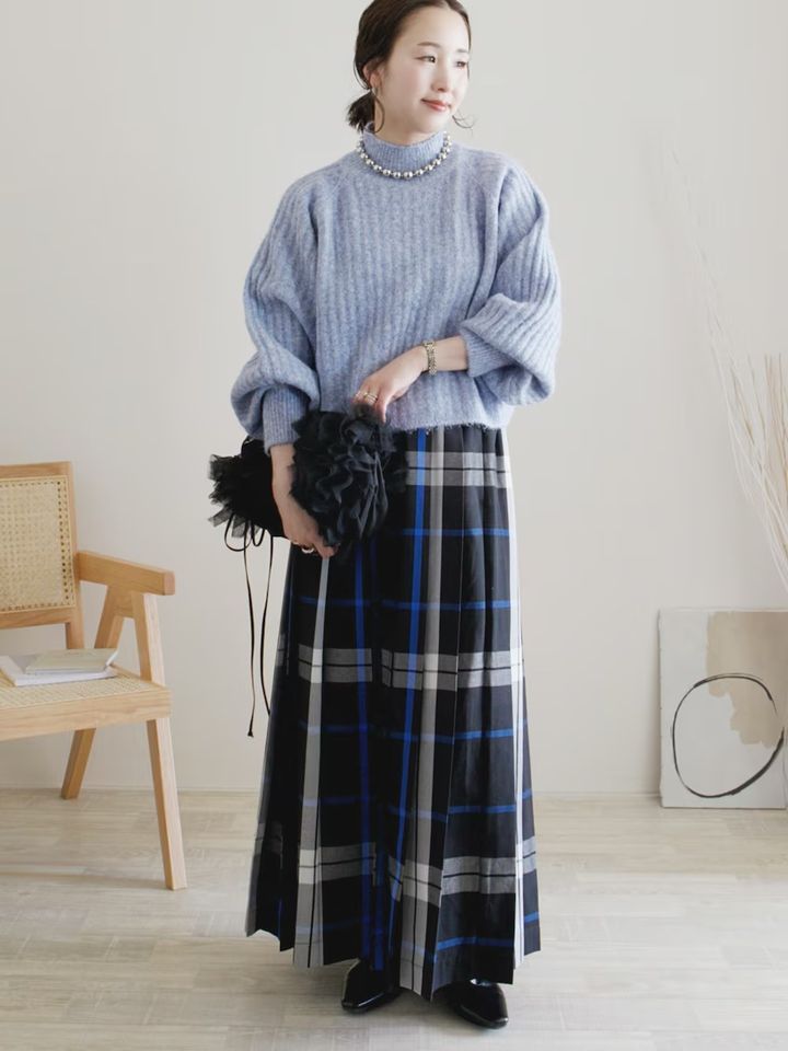 短めニットと相性がいいボトムスは、ずばり「ロング丈」。ロングスカートやワイドパンツなどを合わせると、全身のバランスが取りやすくなるのでおすすめです。腰の位置を高く見せてくれてスタイルアップが叶い、着ぶくれも防げます。