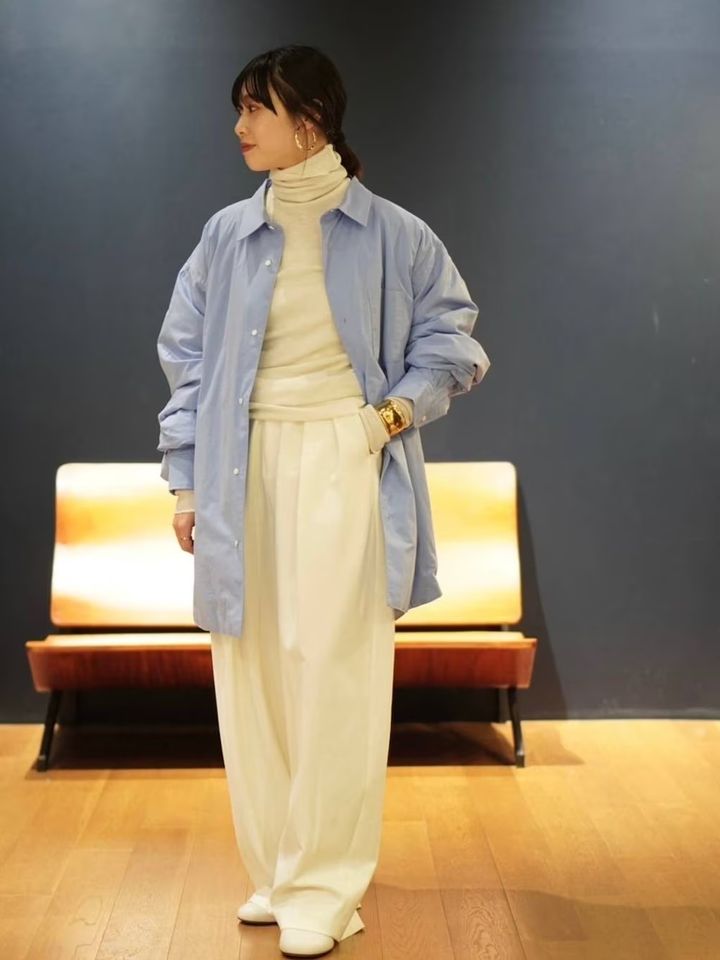 白タートルネック×白パンツ、そこへライトブルーのオーバーサイズシャツを羽織った着こなしです。