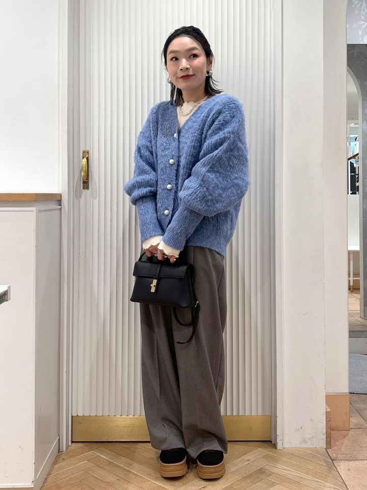 ざっくりとした風合いのゆったりニットカーディガンは、長い期間着られる高コスパなアイテム。程よい厚みで暖かさをキープしながら、ブルー&グレーの配色に春らしいさわやかさも感じられるコーデです。