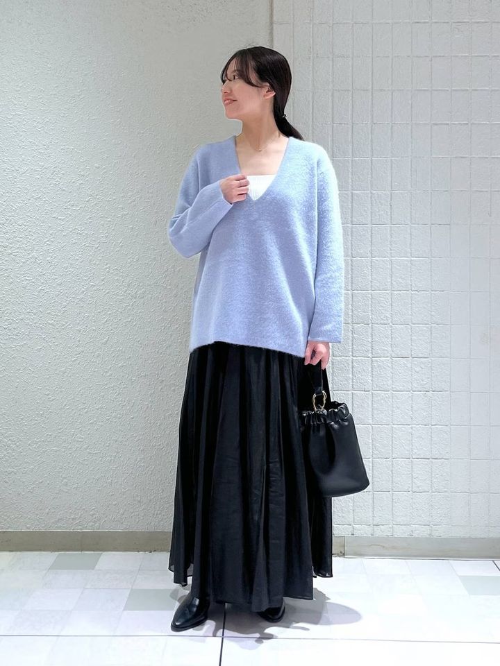 特に写真で着用しているのニットはヒップまでカバーしてくれるロング丈ですが、首元は深めのVネックになっていて抜け感があります。中に重ねるインナー次第で、コーデの印象を変えられるところが優秀です。