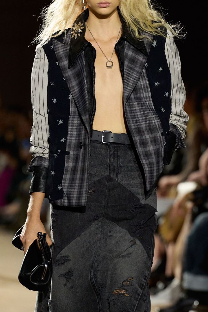 近年はニューヨークにフォーカスしてきたが、今季はより広いアメリカンファッション全体へと視野を広げた。クラフトを軸に異なる時代のユースカルチャーを横断する。ファーストルックでは、チェック、星柄、ストライプを組み合わせたパッチワークジャケットに、ダメージ加工のブラックデニムスカートを合わせた90年代のグランジ調のスタイルを打ち出した。足もとには70年代風のスケートシューズを合わせ、破れたような表情を加えている。