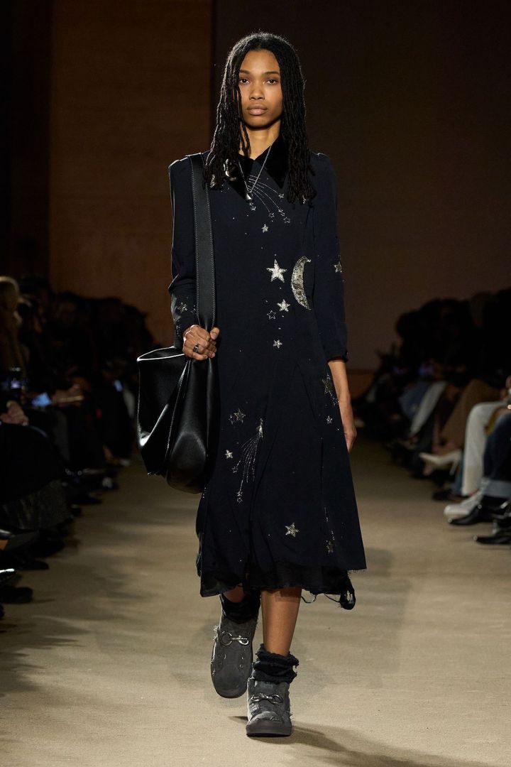 バッグでは、ボニー・カシンが導入したターンロック金具を用いたメッセンジャーバッグが登場。さらに、ヴィンテージの野球やアメリカンフットボールのグローブを再利用したモデルも披露され、ブランドのヘリテージと再構築の姿勢を象徴する。ジュエリーやドレスの装飾には天体モチーフがあしらわれ、無限の可能性や自由な旅を想起させた。