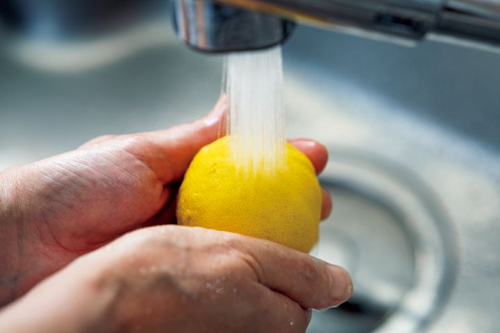 (1)レモンはぬるま湯できれいに洗い、 水けを拭く。