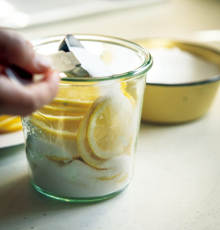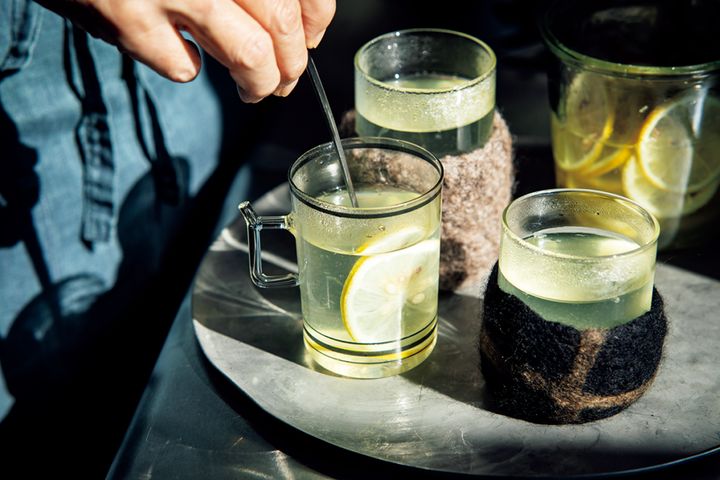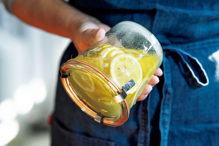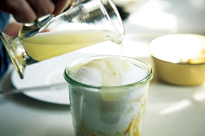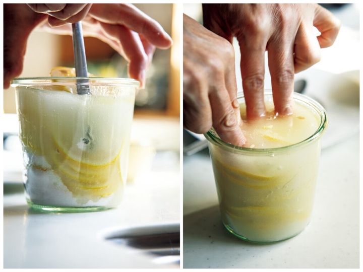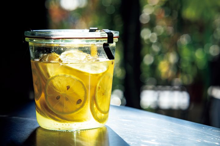 切って、びんに重ねて、砂糖とともにじっくり待つ。びんの中でゆっくりと溶け合い、1週間後には甘酸っぱい香りが広がります。空気がキンと冷える日には、お湯で割ってホットレモンにするのもよし。