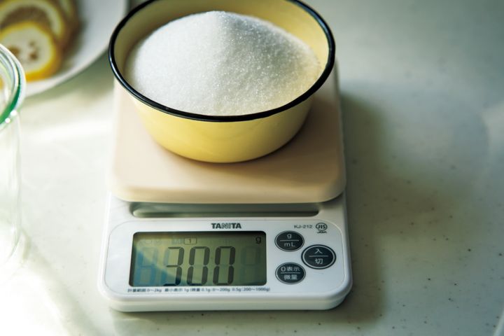 レモンの果汁とレモンの輪切りの重さを量り、同量のグラニュー糖を用意する。