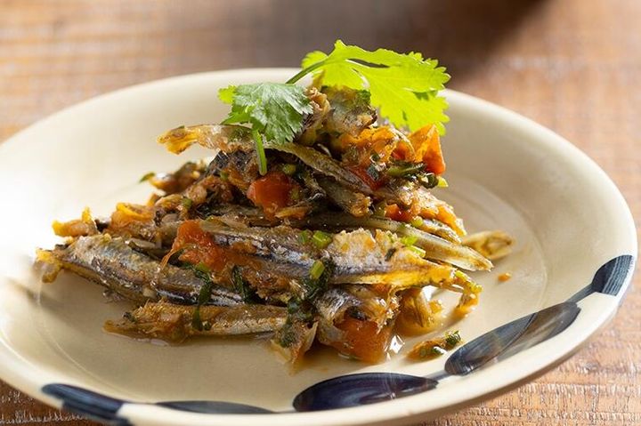 3. 【ゲストも喜ぶユニークな小菜】いりこ+トマト+パクチーの意外性。ピリっと辛味を効かせた後をひく味!「いりこトマト煮」