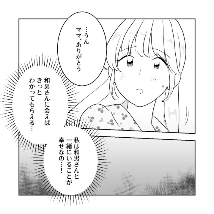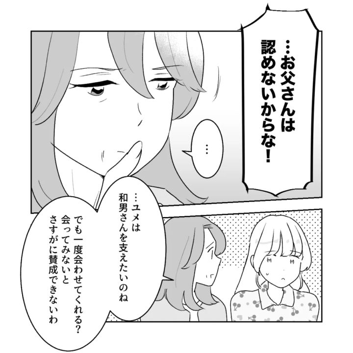 パパは頑なに結婚を認めず、私はどうしても認めてほしい。お互いの想いは噛み合わないまま話は平行線。すると、ママは少し考え込むような仕草をして、「・・・ユメは和男さんを支えたいのね、でも一度会わせてくれる?会ってみないとさすがに賛成できないわ」と優しく言ってくれました。