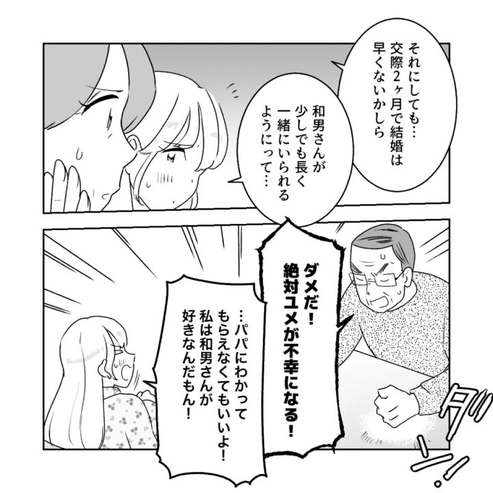 「それにしても、交際2か月で結婚は早くないかしら」ママは、交際期間についても不安を隠せない様子でした。「和男さんが少しでも長く一緒にいられるようにって・・・」そう答えた瞬間パパは声を荒げて、「ダメだ!絶対ユメが不幸になる!」と結婚を断固として拒否します。私もつい感情的になり、「パパに分かってもらえなくてもいいよ!私は和男さんが好きなんだもん!」と声を張り上げてしまいました。
