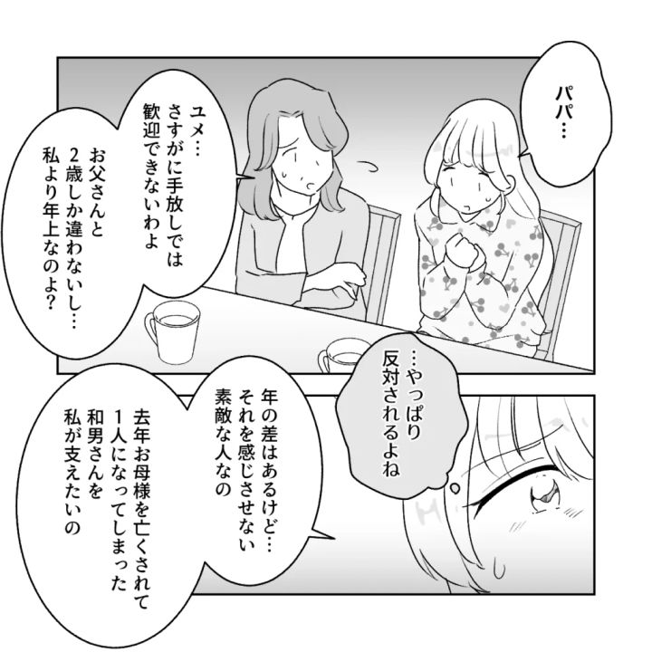 友人のアキさんに続き、お父さんもお母さんも、ユメさんの結婚には反対。冷静に考えれば、自分と同じくらいの年齢の男性が義理の息子になるなんて、そう簡単には受け入れられませんよね。