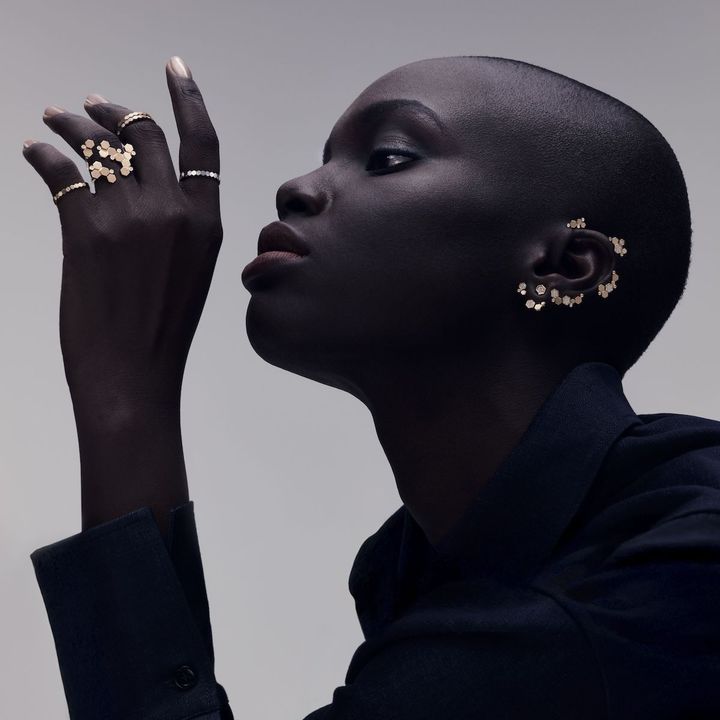 今回の新作では、繊細なハニカムモチーフがアシンメトリーに連なるリングや、耳元をプレイフルに飾るイヤーカフなど、スタイリングに軽やかなリズムを添える多彩なアイテムがラインナップ。