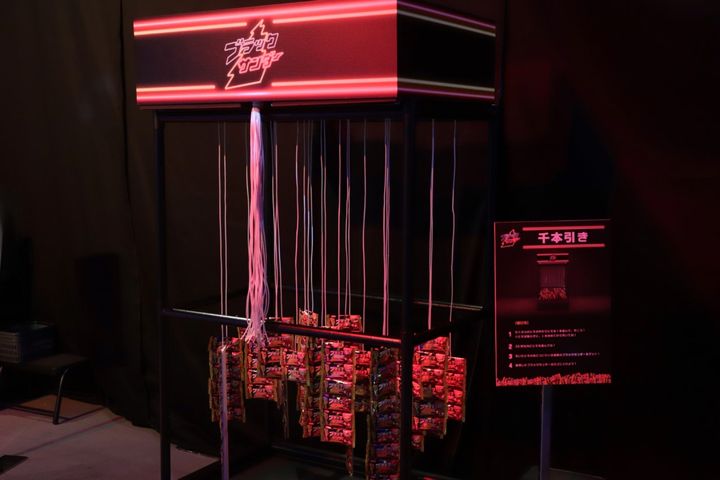 最初にチャレンジしたのは、たくさんの紐の中から 1 本を選んで引く、「ブラックサンダー千本引き」。大量にぶら下がった紐の先にはブラックサンダーが付いており、選んだ紐についていた個数分のブラックサンダーをもらうことができます。
