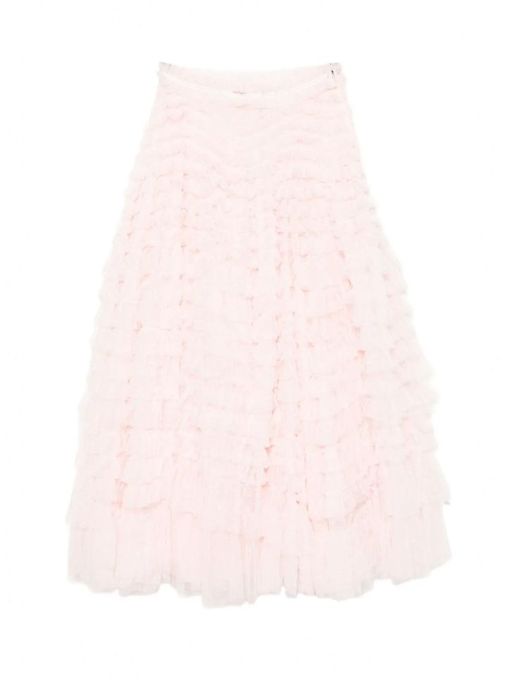 ミニスカートが数多く見られる一方で、ロングスカートもワードローブの定番に。アライアALAÏA)では、 フリルがあしらわれたピンクのロングスカートを、ブラックのタートルネックとシルバーのサンダルに組み合わせた。