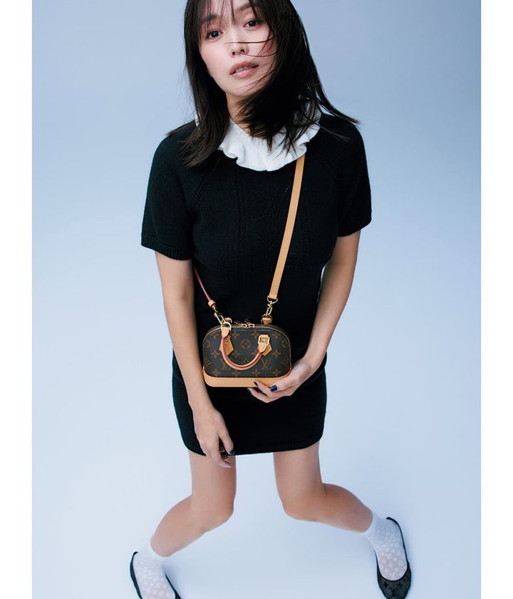 「〝旅〟を想起させるトランク型はまるで宝箱のようなドリーミーなフォルム。アップデートされたモノグラム・パターン、ゴールドのチェーンなど、モダンで存在感のある華やかさは、あえて気負わずカジュアル使いを」(モデル・蛯原さん)