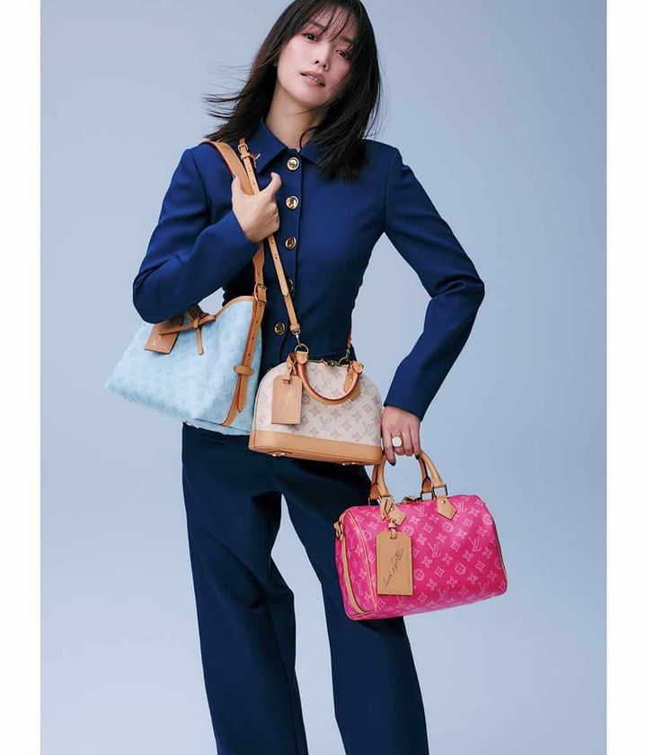 春の装いにピッタリなチアフルな顔ぶれが続々。〈右〉鮮やかなピンク×リッチなヌメ革のコンビネーション。バッグ「スピーディ・バンドリエール 25」※ショルダーストラップ付W25×H19×T15㎝¥416,900〈中〉〝モノグラム〟誕生の原点、ヘリテージへの回帰を淡色のカラーリングで演出。「アルマ BB」W23.5×H17.5×T11.5㎝¥368,500〈左〉タブレットを収納できる万能なデザイン×小物用の取り外し可能なファスナー式ポーチが兼備。「キャリーオール PM」W29×H24×T12㎝¥511,500 3点ともモノグラム・アニバーサリー コレクション ジャケット¥561,000パンツ¥253,000※ともに予定価格リング¥92,400(すべてルイ・ヴィトン/ルイ・ヴィトン クライアントサービス)