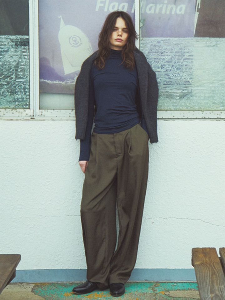 【POINT】ネイビーのタートルにカーキのパンツ。濃度のある寒色合わせは白で抜かず、黒ニットで深みを加えると、洗練されて見えるグラデーション風スタイルが完成。