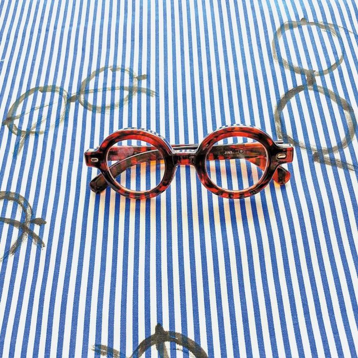 以前はアルファベットの文字だけ描いたけれど、今回は絵にする。単純な線画にしようと身の回りの絵になりそうなものを物色する。そしてメガネに決めた!
