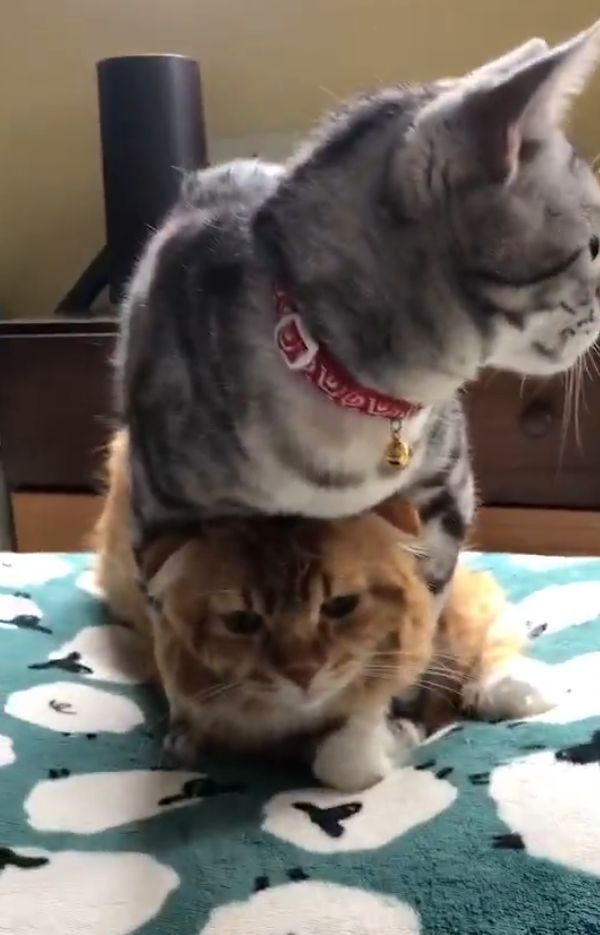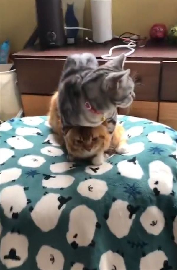 3. 鏡餅みたい!?ネコの上に乗りかかっているネコの姿が話題に「重すぎるにゃ」「下の子のなんとも言えない表情」
