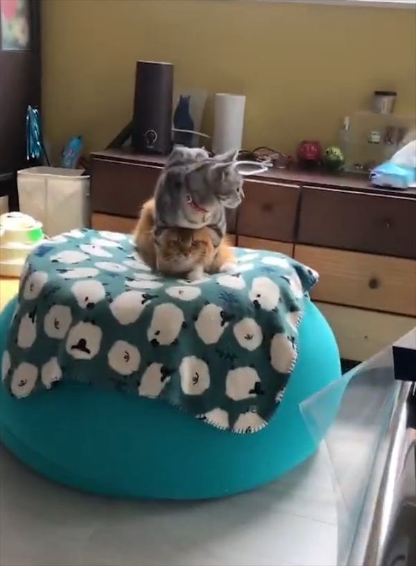 大きなクッションの上に乗っかっているのは、愛猫たち。 ところが、この子たちは重なるようにしてクッションの上にいます。
