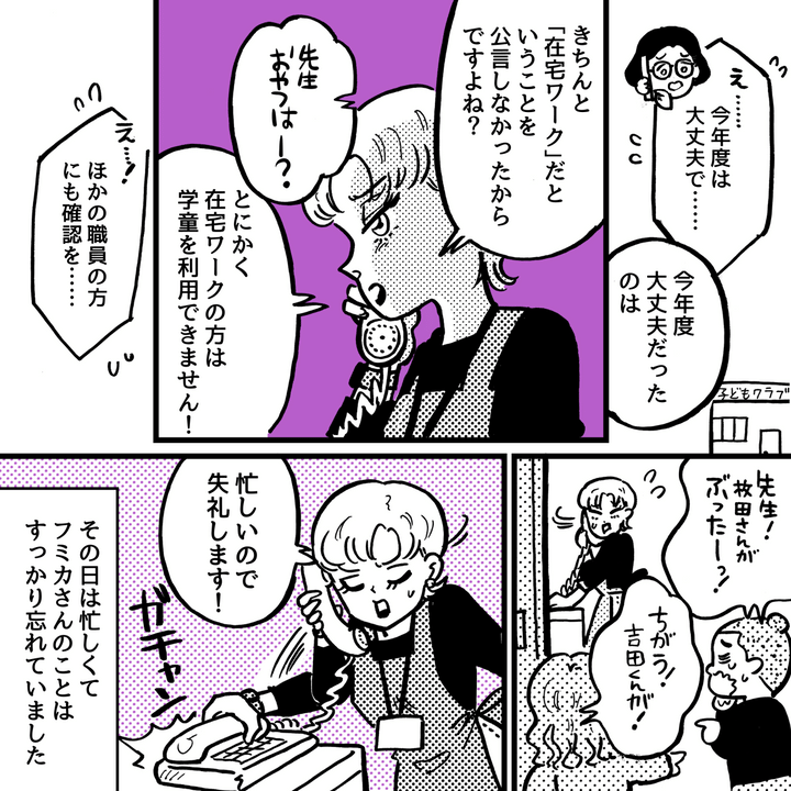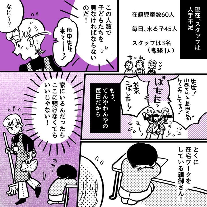 学童を利用する子どもの人数に対して職員の数が少なく、てんやわんやの毎日です。在宅ワークをしているのなら、家にいるのだから子どもが家に帰ってもいいですよね? 子どもを「邪魔者」扱いして学童に預けているように思ってしまうのです。