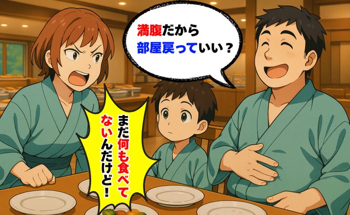 旅行中の夕飯で夫が「満腹!部屋戻っていい?」は?私は息子の世話で一口も食べてないのに…キレた結果