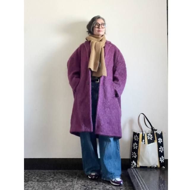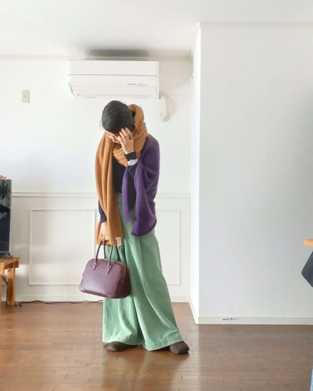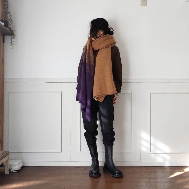 パープルと合わせる茶色マフラーのコーデ