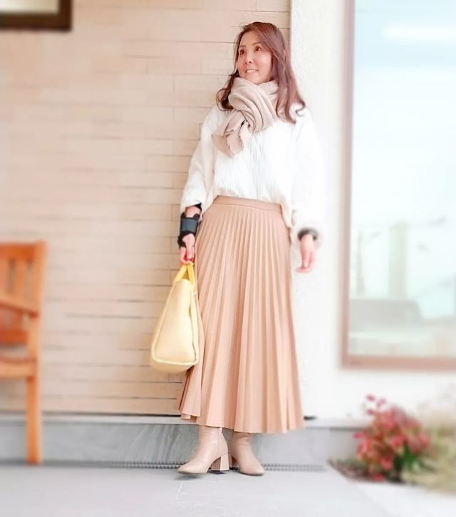 ホワイトと合わせる茶色マフラーのコーデ