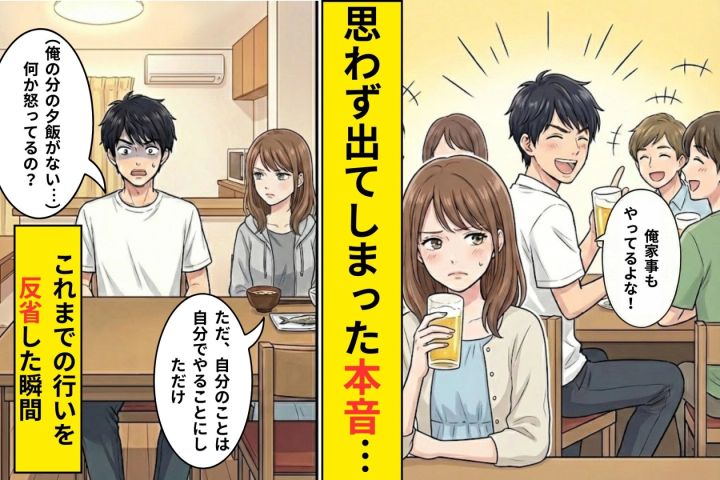 家事を「やってあげている」と思っていた自分の考え方は、どこか間違っていたんだと思います。彼女も同じように仕事をしながら家事をしていたのに、それを当たり前だと思っていたことに気づきました。今は、自分の食事も自分で用意する日々です。不便さを感じながら、彼女がどれだけのことをしてくれていたのかを実感しました。