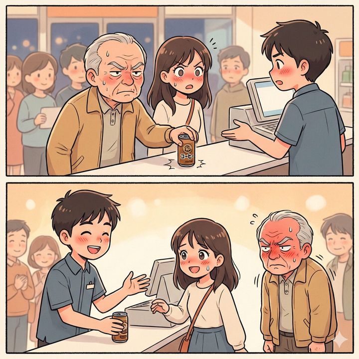 あまりに堂々とした割り込みに一瞬呆気にとられましたが、男性は悪びれる様子もなく、缶コーヒーを1本、ドン!とレジ台に置きました。