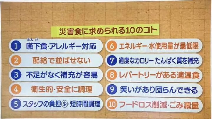 厳冬期の防災に詳しい根本教授は、災害食に求められる10のポイントを挙げています。