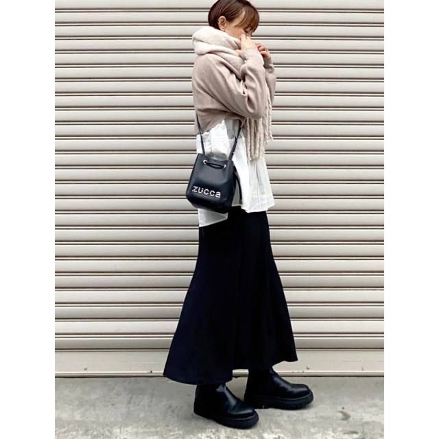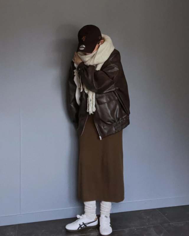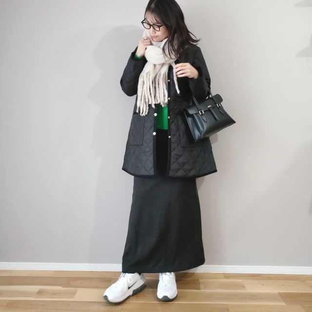 白マフラー×濃色アウターのコーデ