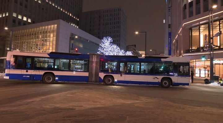 1月、イルミネーションがきらめく札幌駅前通りには市民にはおなじみ、青と白のバスが…いつもより長い?バス2台をつないで1台にした「連節バス」。長さは18mあります。