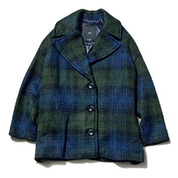 ブルー×グリーンチェック柄コート/MANGO ダークグリーン+ダークブルーによる暗めのインテリ配色で、育ちのいいチェック柄に大人っぽさにつながる重みを。シャープなVを描く大きなえりが、顔まわりにキレをプラス。
