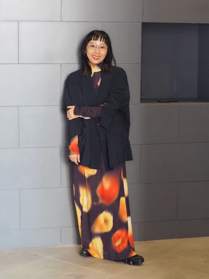 一枚でコーディネートが決まる柄物ワンピースは「ヘリンドットサイ」の新作。「料理に彩を添えるパプリカから着想を得て、大胆なプリントワンピを作ってみました」。シックなジャケットを重ねることで、ドレッシーな雰囲気をほどよく中和。足元はスニーカーでカジュアル要素をプラスして、日常になじむスタイリングに。