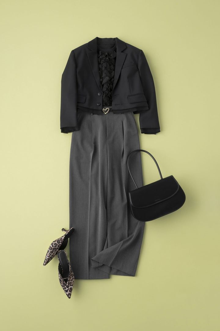 “きちんと感”は譲れない仕事の日でも、丈バランスで魅せる大人のジャケットスタイルを。コンサバに傾きがちなグレーのワイドパンツも、クロップド丈ジャケットを合わせるだけで一気に鮮度がアップ。重心が自然と上がりスタイルアップも叶います。花びらのようなフリルを贅沢にあしらったフェミニントップスをインして。黒を選べば甘さを程よくセーブしつつ顔まわりはしっかり華やかに仕上がります。ハートモチーフのベルトやレオパード柄のパンプスで遊び心をプラスして、“ほぼクロ×甘ニッシュ”コーデの完成です。