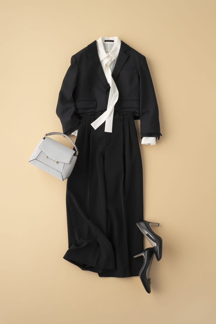 ジャケット¥71,500(ザ サードマガジン/サードマガジン)タイブラウス¥41,800(チノ ブラックフォーマル/モールド)パンツ¥9,350(エルーラ/アダストリア カスタマーサービス)バッグ¥99,000(ストラスベリー/ユナイテッドアローズ 六本木ヒルズ店)パンプス¥19,250(ダイアナ/ダイアナ 銀座本店