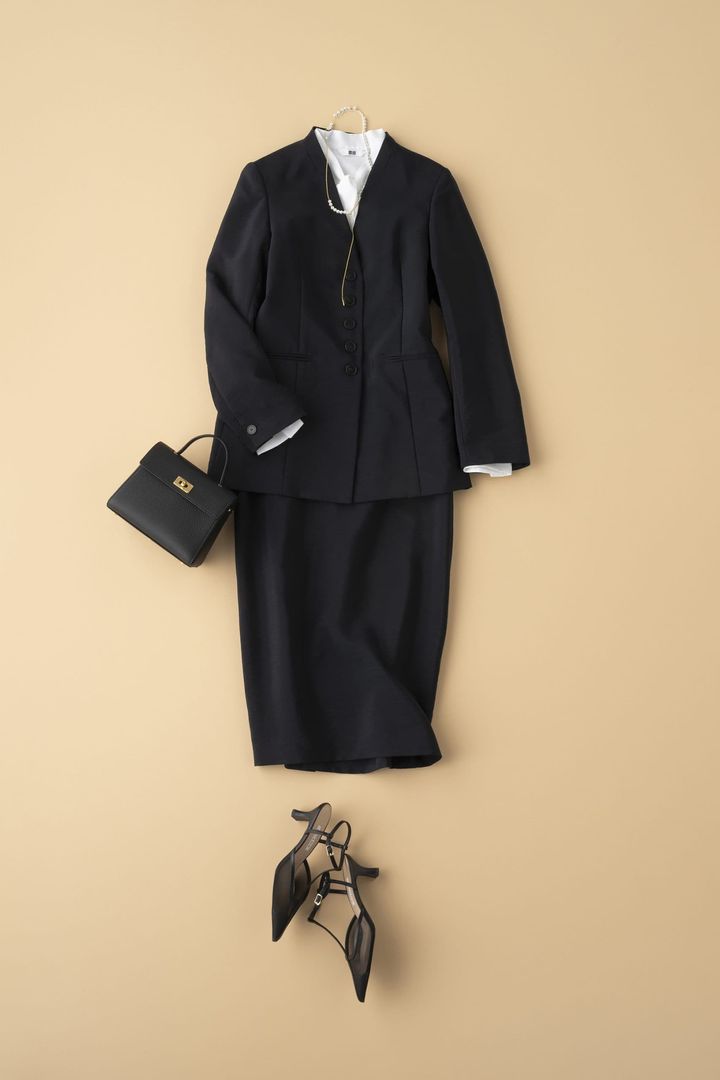 ジャケット¥17,600スカート¥16,500(ともにアパートバイ/アダストリア カスタマーサービス)ブラウス¥2,990(ユニクロ)バッグ¥209,000(ミチノ・パリ/アマン)パンプス¥17,600(ダイアナ/ダイアナ 銀座本店)ネックレス¥27,500(ヤヌカ/トゥモローランド)