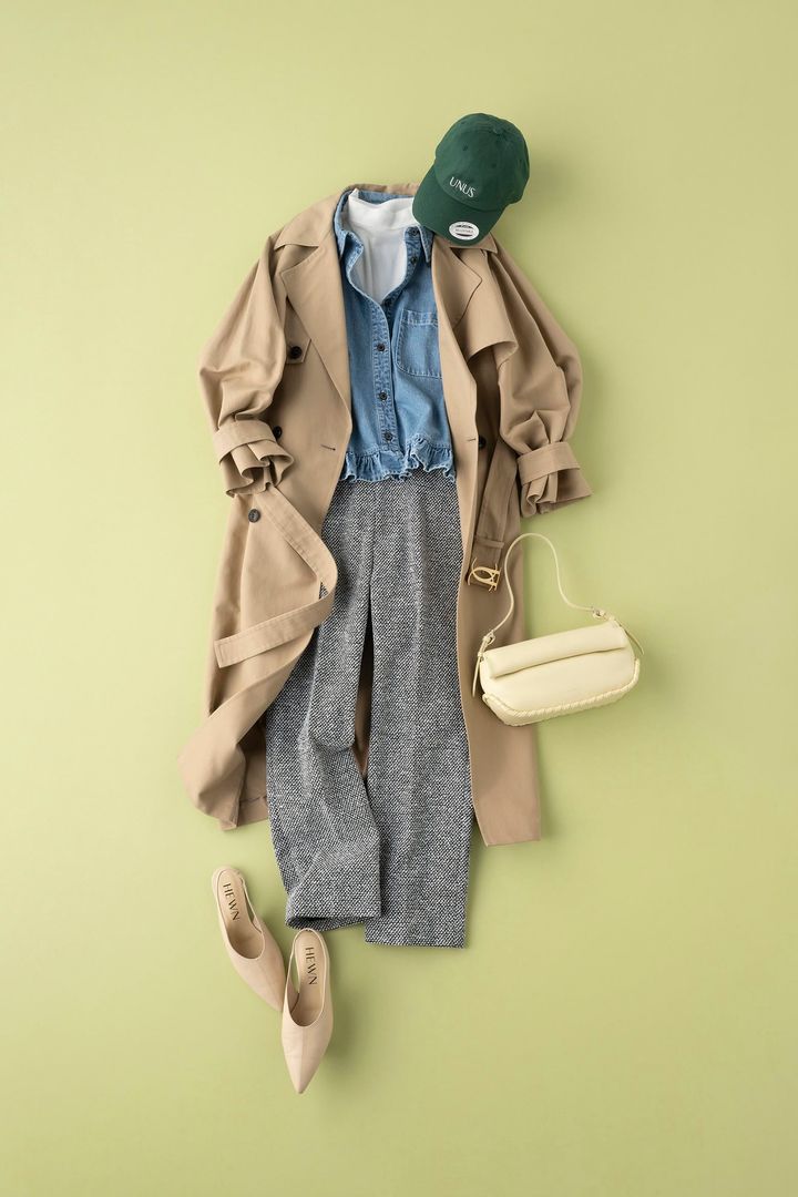 日帰り旅行の日は、移動も観光も写真映えも欲張りたい…。ツイード調素材のパンツなら、動きやすく大人らしい“キレイ見え”も叶います。デニムシャツに白Tをインすることで顔まわりはクリーンに、トレンチを羽織ってきちんと感と防寒対策も忘れません。日焼け対策にもなるキャップをプラスして大人のカジュアルMIXコーデに。バッグや足元はキレイめに、歩きやすさ重視のフラットでもポインテッドトゥを選べばラフになりすぎない大人コーデの完成です。