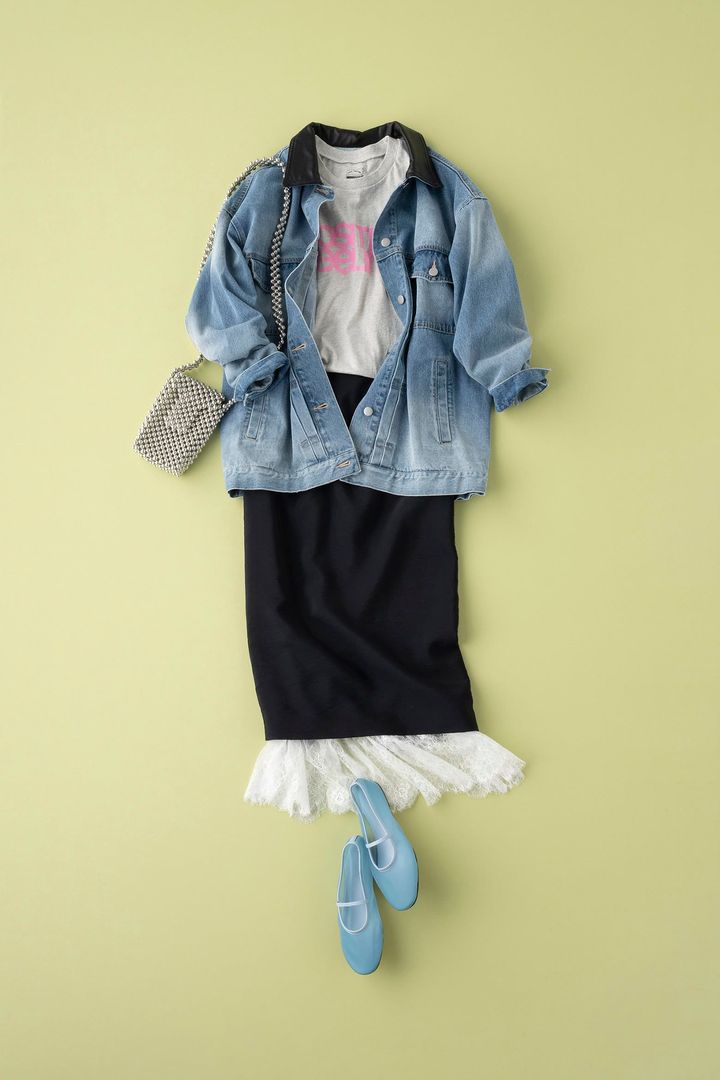 女子会ランチへはレーススカートをレイヤードして、スカートを主役にした華やぎスカートスタイルで。繊細なレーススカートには、あえてロゴTをインして肩の力を抜くのが今の気分にマッチ。オーバーサイズのデニムジャケットを羽織れば、甘さが程よく抑えられぐっとこなれた印象に仕上がります。バッグやシューズは存在感あるデザインを選んで遊び心プラス。オフdayならではの高揚感あるカジュアルMIXコーデの完成です。