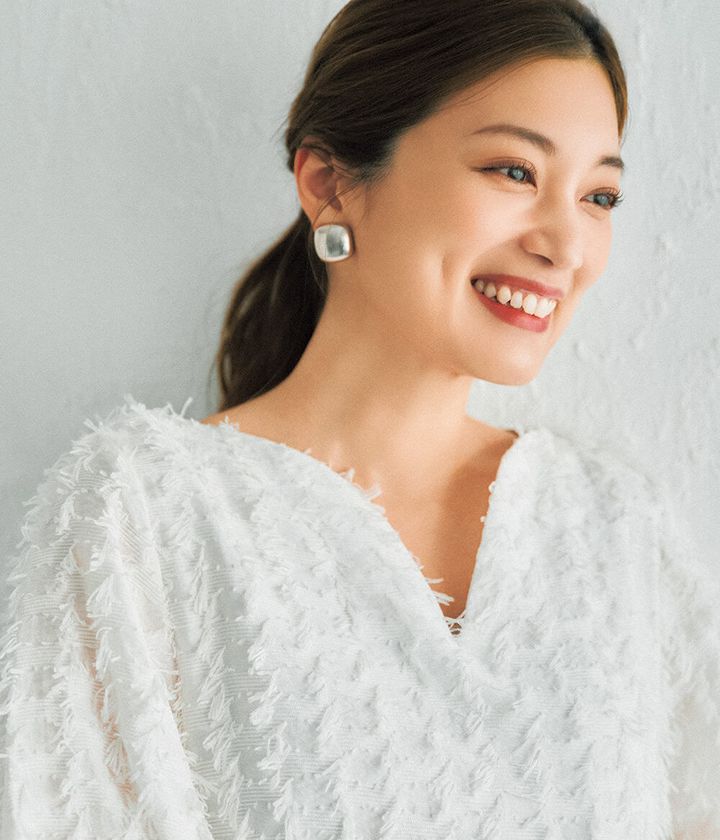 <TOP写真>カーディガン¥26,400パンツ¥27,500(ともにミースロエ)ブラウス¥19,910(FRAY I.D/FRAY I.Dルミネ新宿店)ピアス¥12,100(ニナ・エ・ジュール/ショールーム ロイト)